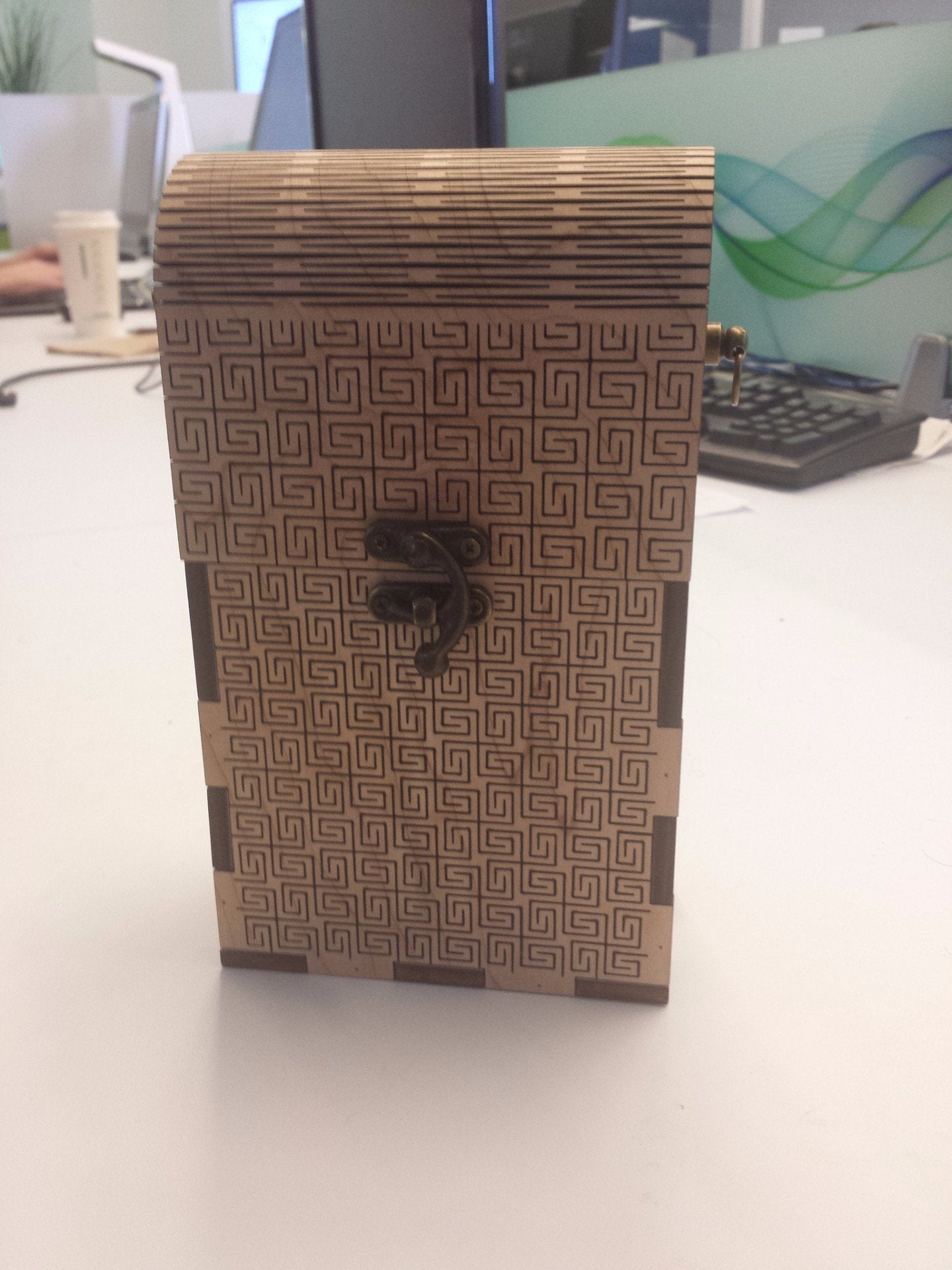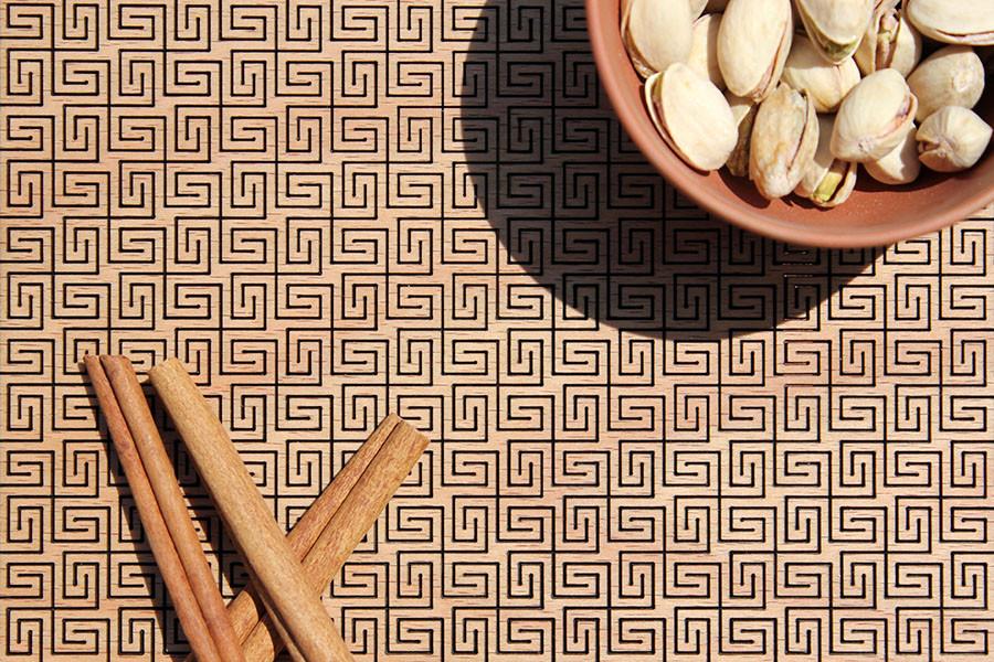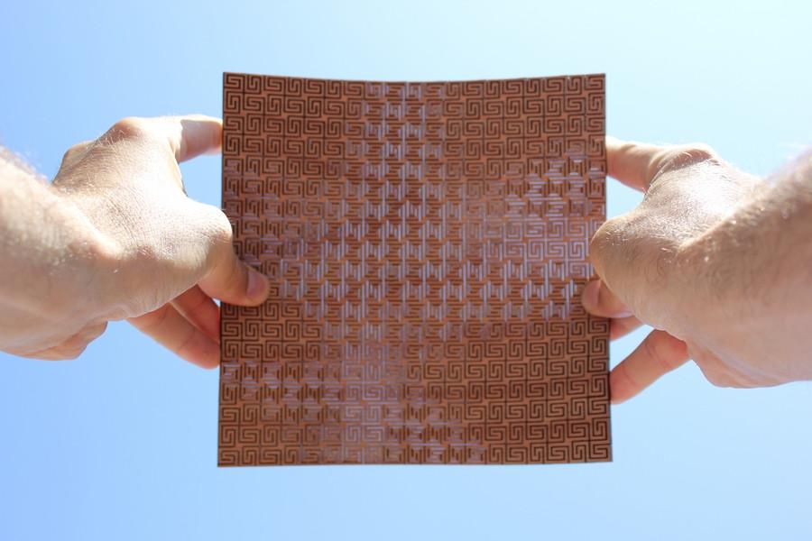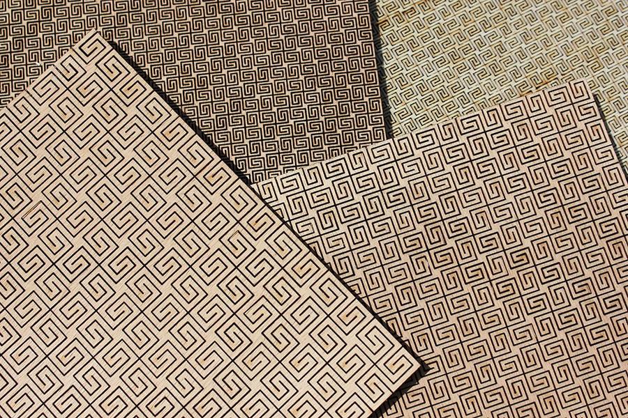 I immediately turned my machine on and started playing with this surface. The feeling of holding that piece of wood in my hands was incredible, something that just seconds earlier, was a stiff piece of plywood was now flexible like paper. But only in one direction, in the other was still stiff. Then I decided to cut the surface to enable it to bend in both directions, so that I could achieve double Gaussian curvature, positive and negative. After a couple of failed attempts that were based on a variety of perforations, I realized that what I was doing didn’t make any sense. I’ve studied the way in which the first surface was cut. In order to be bent it was turned into a series of slender elements that are easily twisted, which are interconnected on fixed points. The greater the distance between the fixed points, and the slimmer the elements, the more flexible the surfaces is. Although an element can twist for only a few degrees (before it breaks) when multiplied many times, the flexibility is incredible. I realized I should apply the same theory in both directions – so I turned the line elements into a rectangular spiral, whose segments twist in both directions, and in that way I connected the fixed point with very long slender elements. The result was even more fascinating.