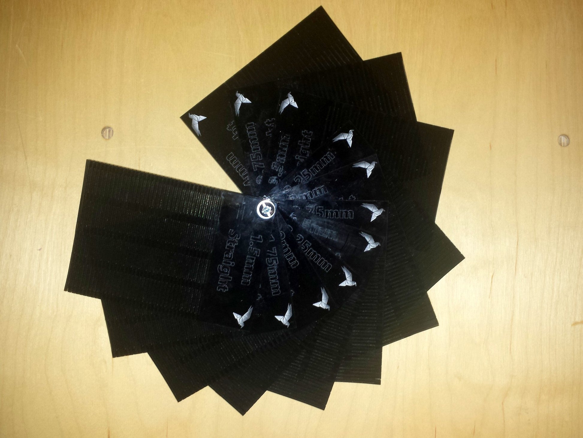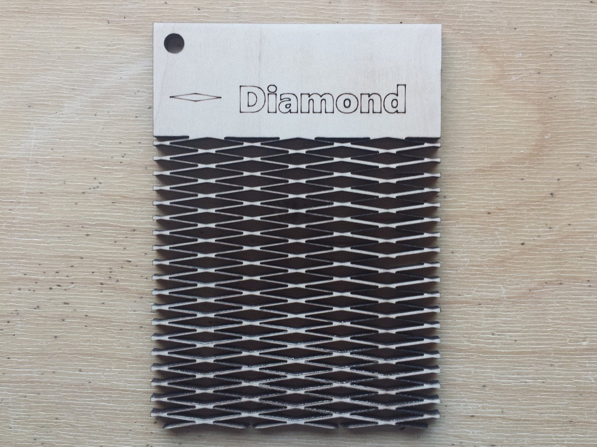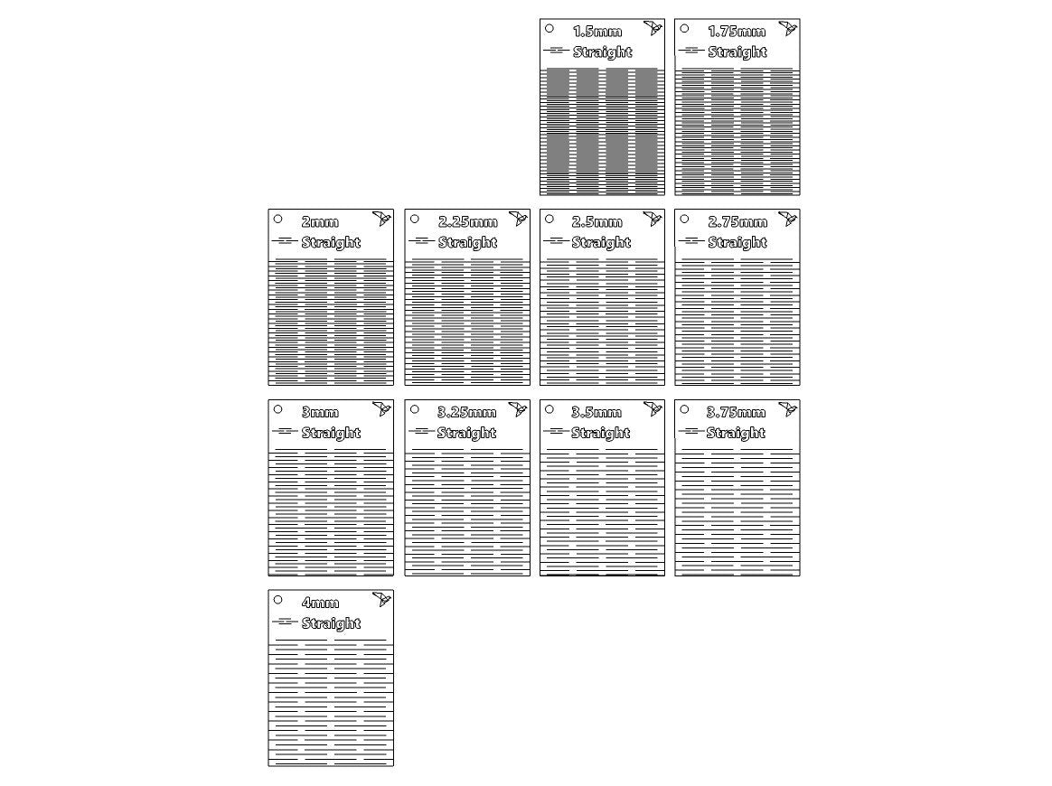 Here's a collection of living hinge swatches. The first set shows a variety of different hinge patterns. They will help you see which patterns are more flexible. The second set shows the straight pattern in a variety of different spacings so you determine the best one for your needs.