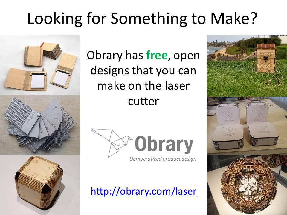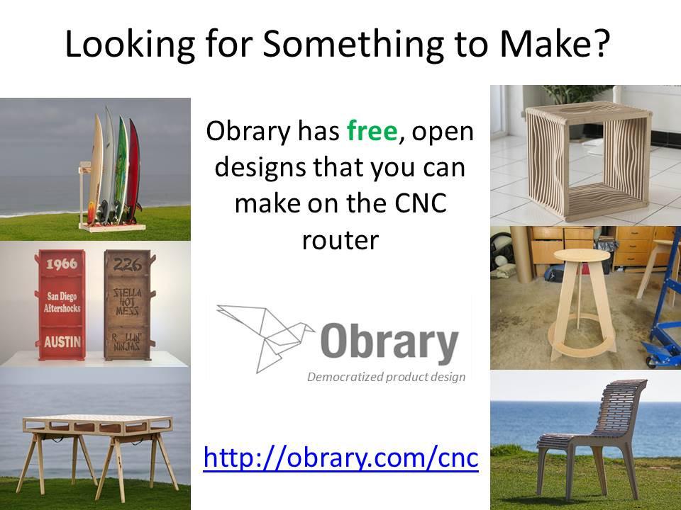 - Slides - each files contains one slide. There is a file for the laser cutter and another for the CNC router. The source file is in PowerPoint. PDF versions are also provided.