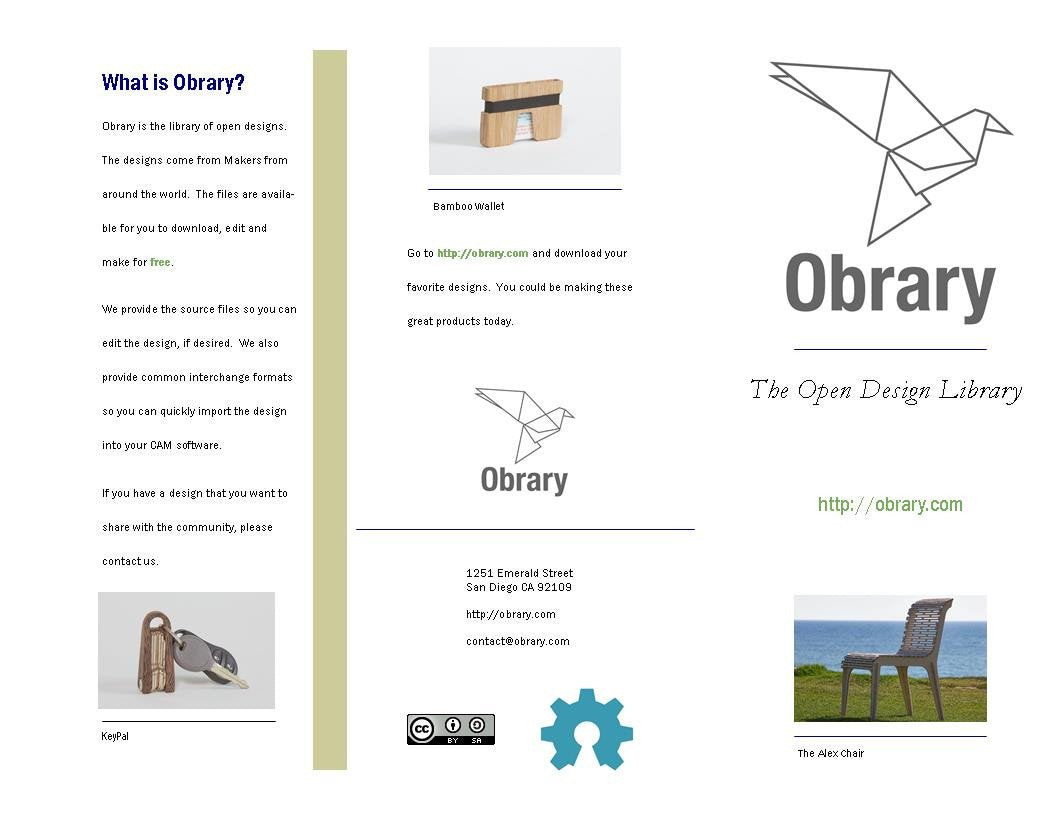 - Brochure - There's a tri-fold brochure that explains Obrary's definition of open design. The source file is in Microsoft Publisher. A PDF version is also provided.